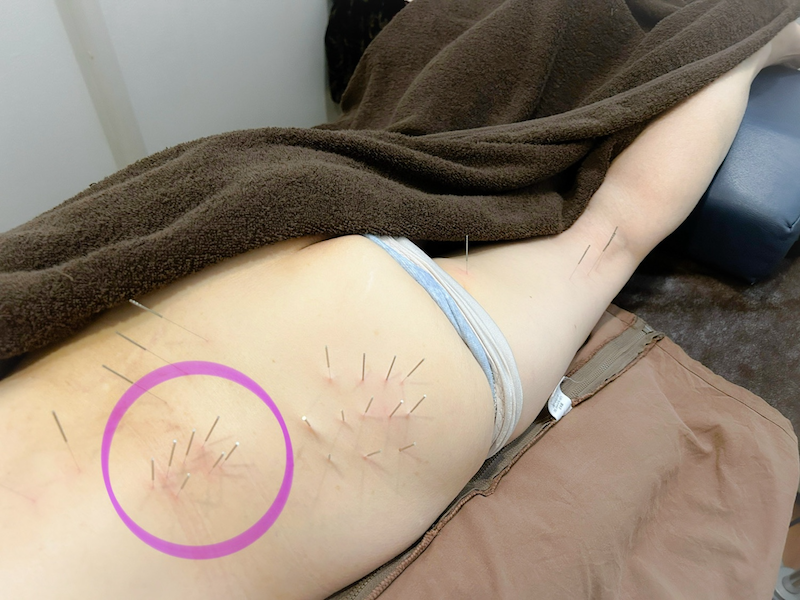 症状の出る姿勢がはっきりしていたので、当初より大腰筋が痛みの原因となっていると考え、大腰筋を中心に臀部や太もも裏の筋肉へのトリガーポイント鍼治療を行いました。