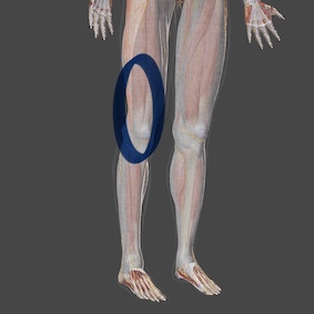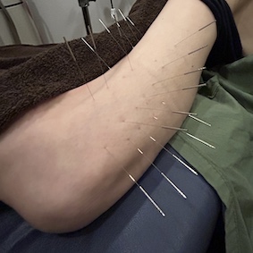 写真左は長脛靭帯・外側広筋(右丸のあたり)への刺鍼です。