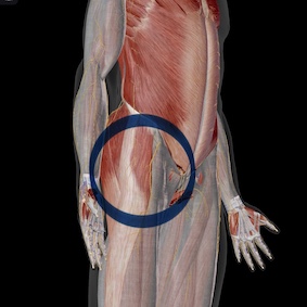 左の写真は、坐骨神経痛でのトリガーポイント後発部位のひとつである、中臀筋(右写真丸のあたり)への施術です。