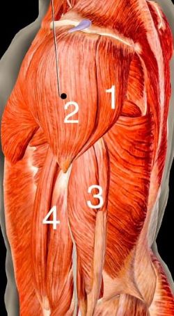 1三角筋(後部繊維)/2三角筋(中部繊維)/3三頭筋/4二頭筋、または腕橈骨筋や回内筋の筋膜の癒着が強いと考えられます。