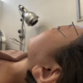 上の写真は、咬筋と側頭筋のトリガーポイントに鍼でアプローチいているものです。