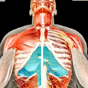図:青い部分が横隔膜・向かって右側の肋骨の間に見えるのが外肋間筋