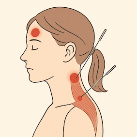 1回目の施術では、後頭下筋群と頭部半棘筋のトリガーポイントに鍼でアプローチ。