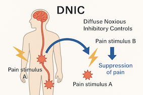 この図は、DNIC(Diffuse Noxious Inhibitory Controls)=広汎性侵害抑制調節を表したものです。